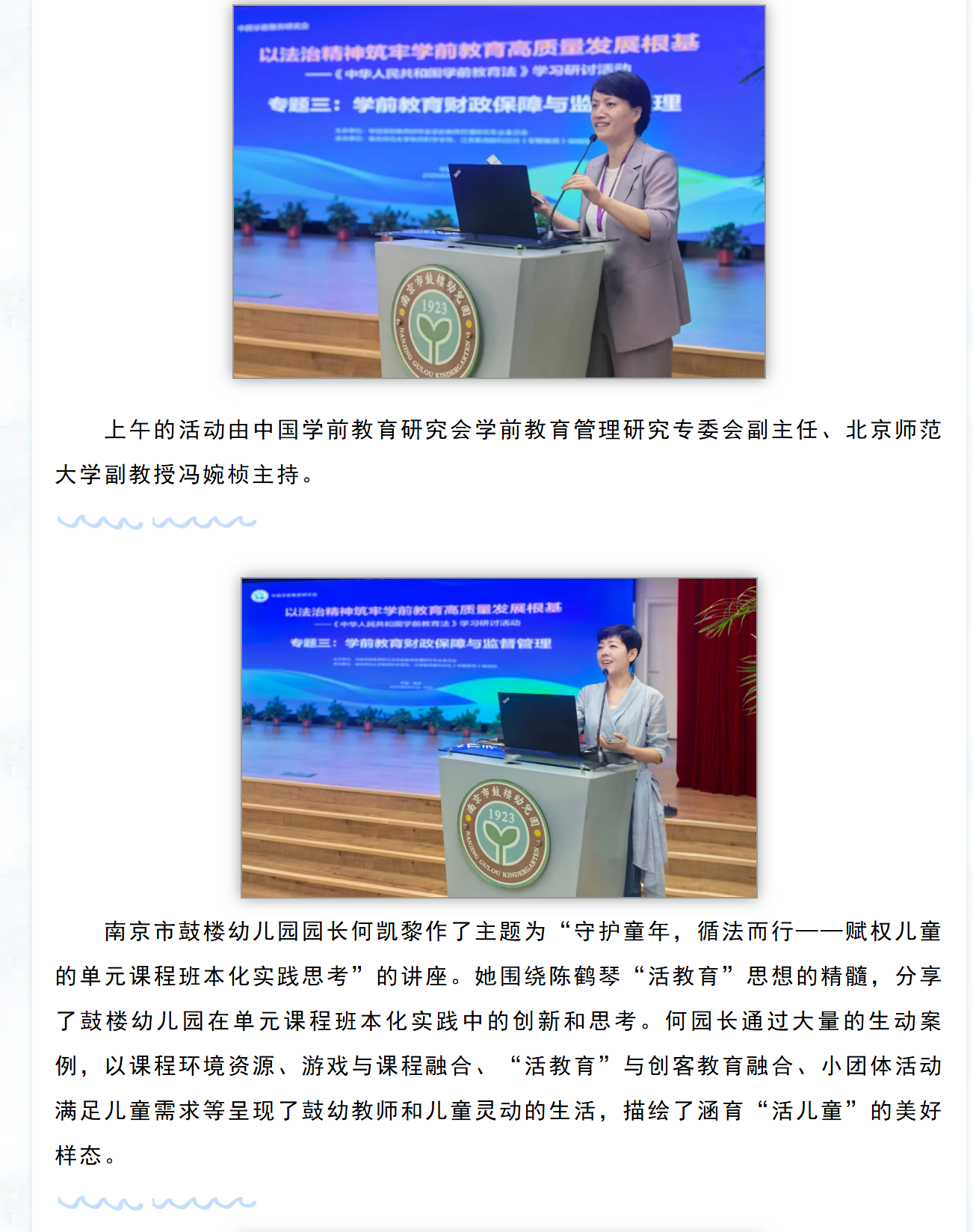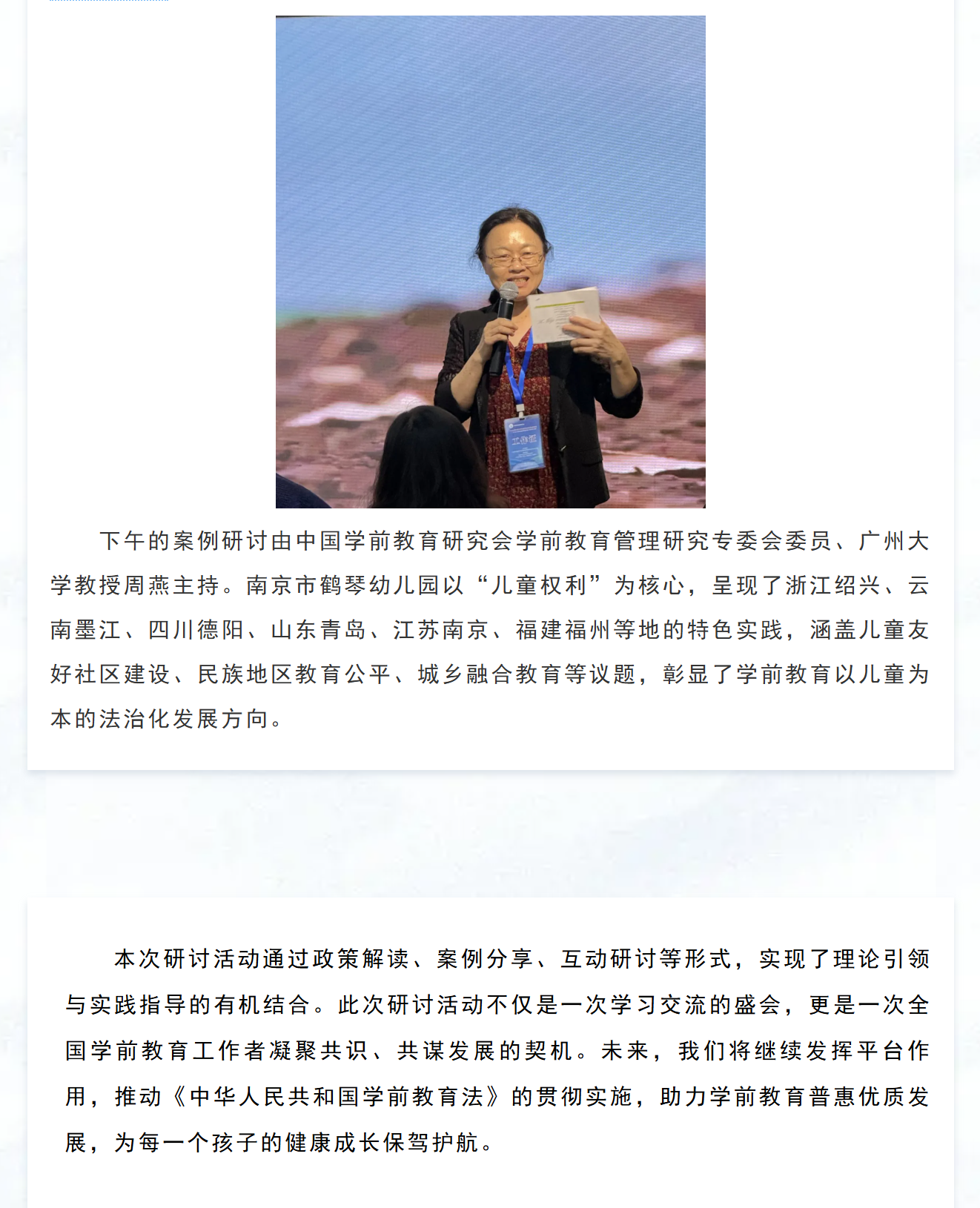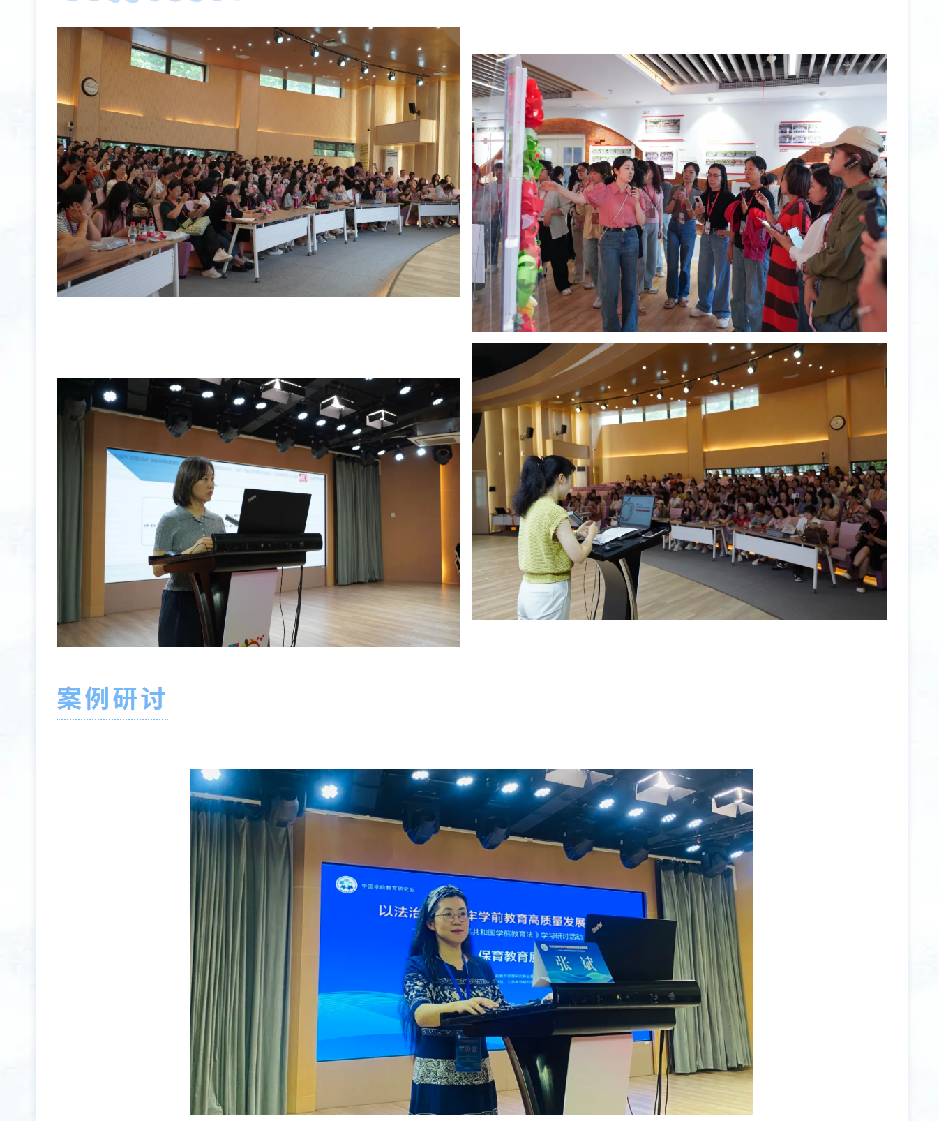 下午的案例研讨由中国学前教育研究会学前教育管理研究专委会副主任、江苏第二师范学院副教授张斌主持。南京市实验幼儿园会场聚焦依法保教与质量提升,来自四川成都、内蒙古鄂尔多斯、浙江宁波、江苏苏州、上海等地的园长和教研员分享了区域教研创新、儿童观察支持、课程建设等实践案例。